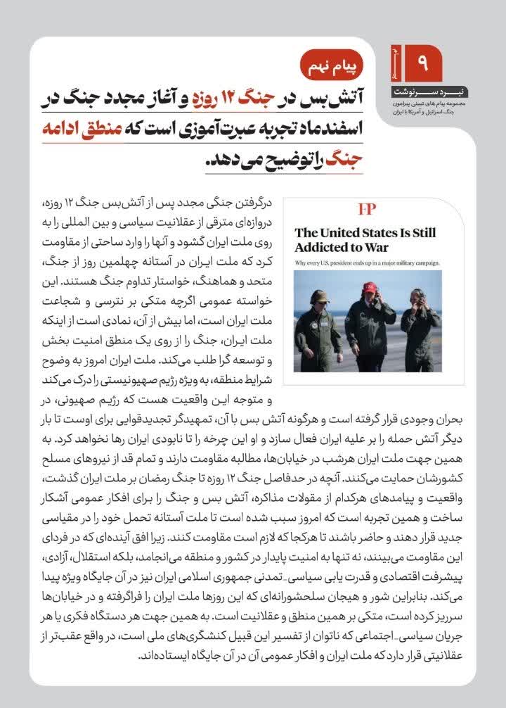 آتشبس در جنگ ۱۲ روزه و آغاز مجدد جنگ در اسفندماه تجربه عبرتآموزی است که منطق ادامه جنگ را توضیح میدهد.