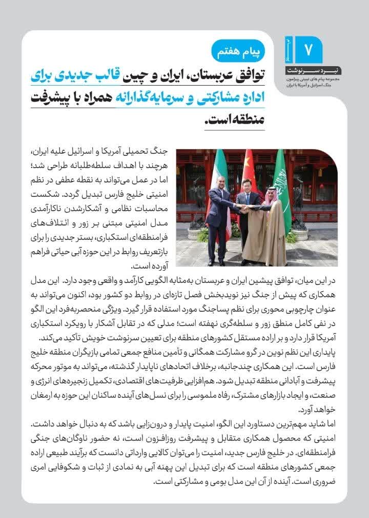 توافق عربستان، ایران و چین قالب جدیدی برای اداره مشارکتی و سرمایهگذارانه همراه با پیشرفت منطقه بوده است.